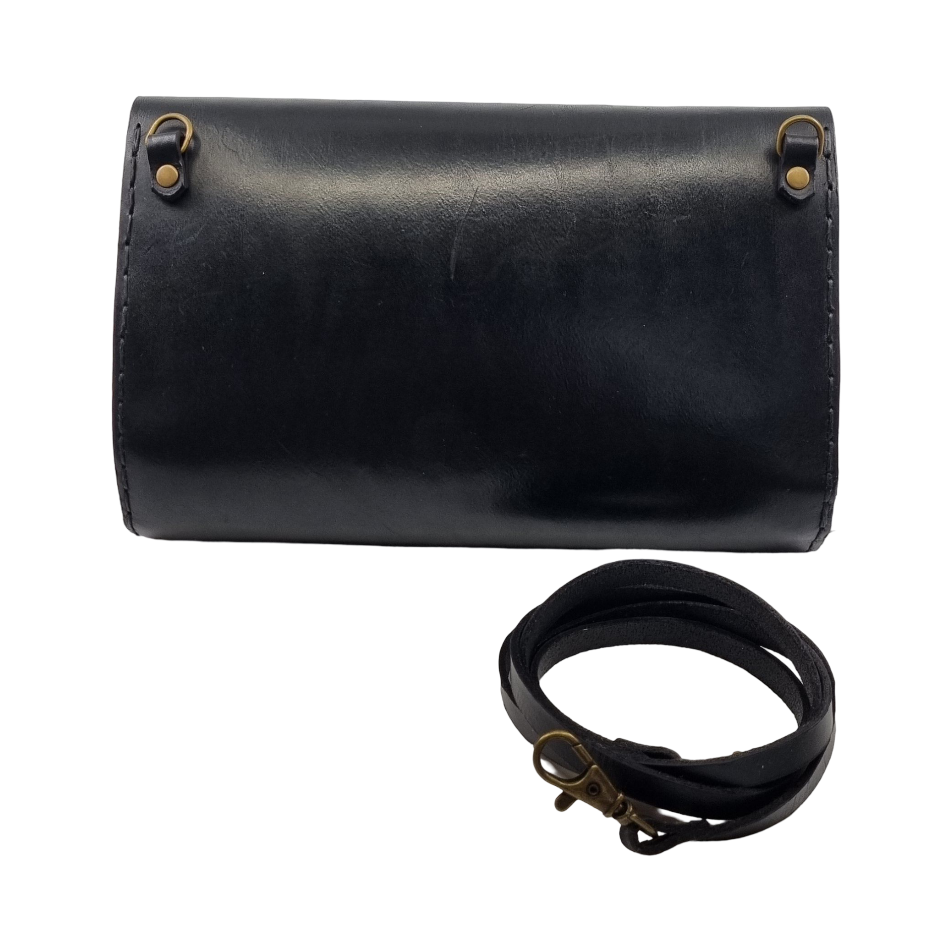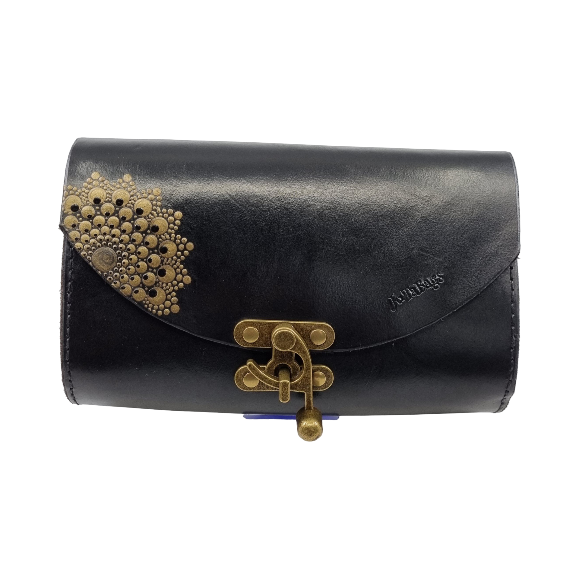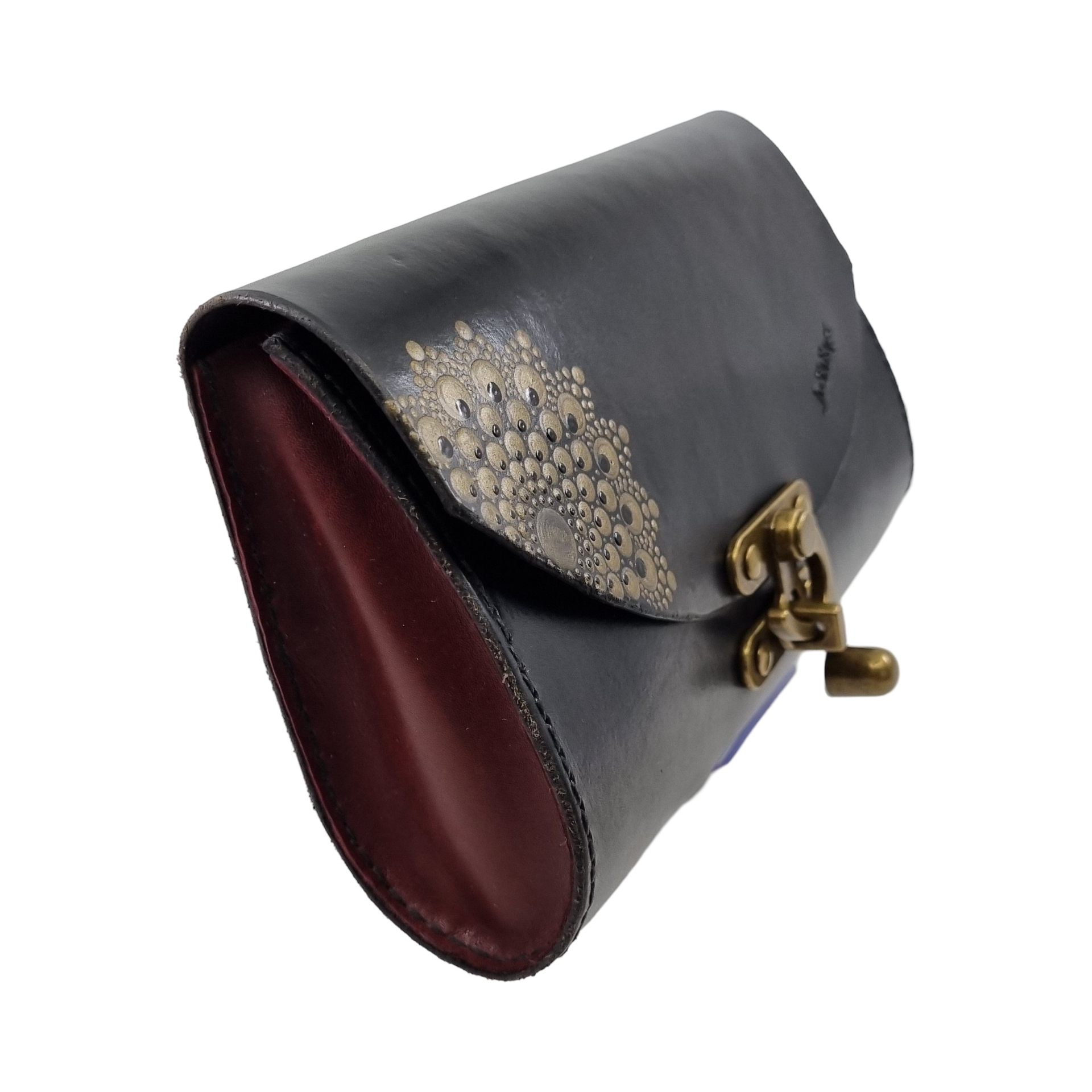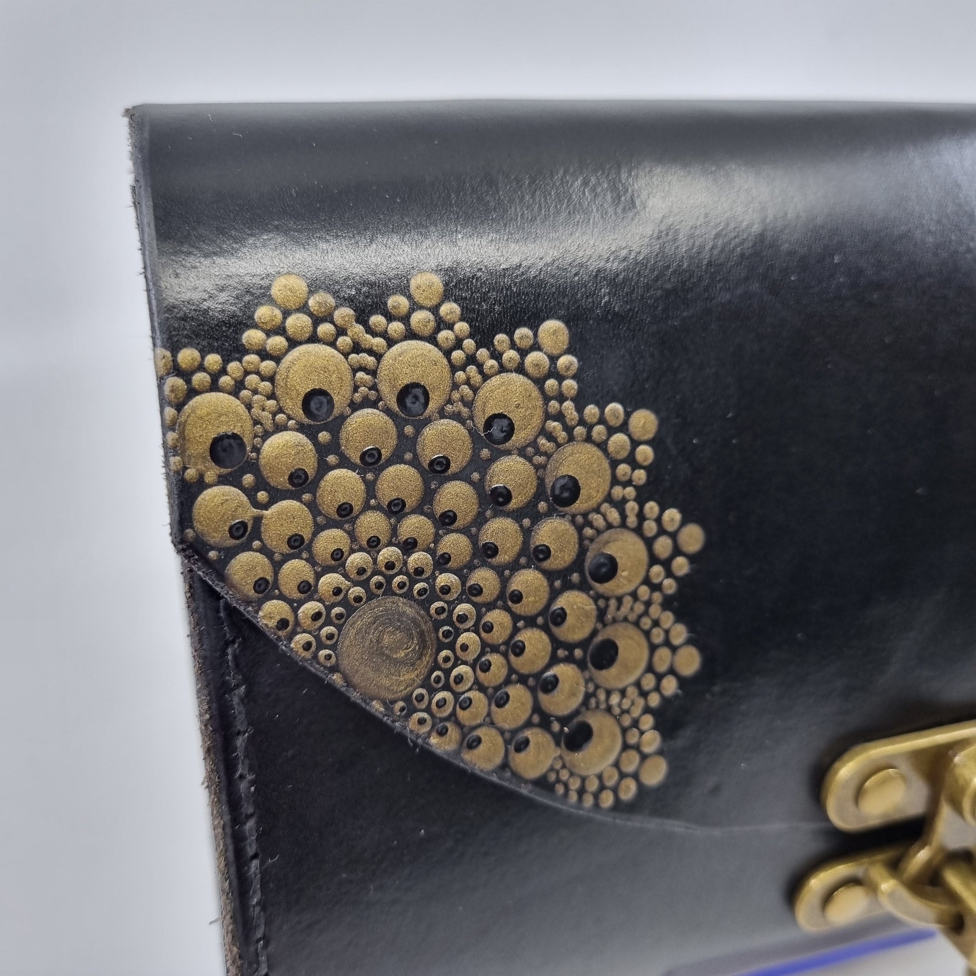 Sort håndsydd lærclutch med avtagbar skulderrem og støpt messinglås. Vesken har en nydelig gull/sort mandala og vinrød belg. Vesken er en Unika,